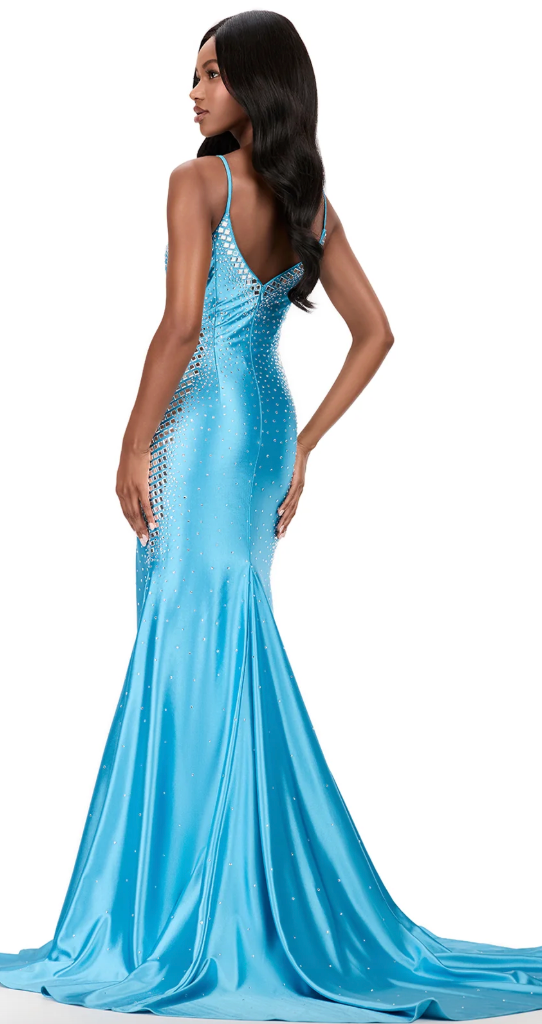 Turn heads in this fitted ASHLEYlauren Style 12193 jersey gown adorned with dazzling mirror stones that create a show-stopping effect. The plunging neckline and sleek silhouette enhance your curves, while the stretch jersey fabric ensures both comfort and elegance.