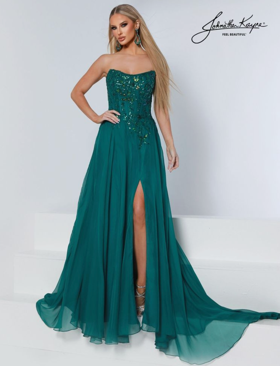 Effortless beauty in motion. This strapless A-line gown brings fairytale energy with a sequin lace applique corset bodice and flowing skirt. The lace-up back and subtle slit keep the look flirty, making it a dreamy choice for prom or teen pageants.