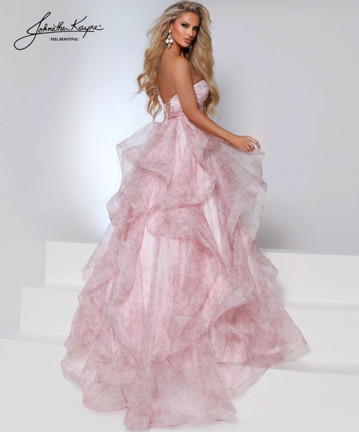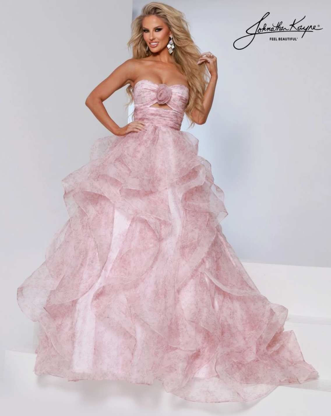 Romance comes to life in this strapless printed ballgown with layered ruffles cascading from waist to hem. A ruched bodice and rosette detail add feminine charm—perfect for prom or pageant queens ready to float across the stage in elegance.