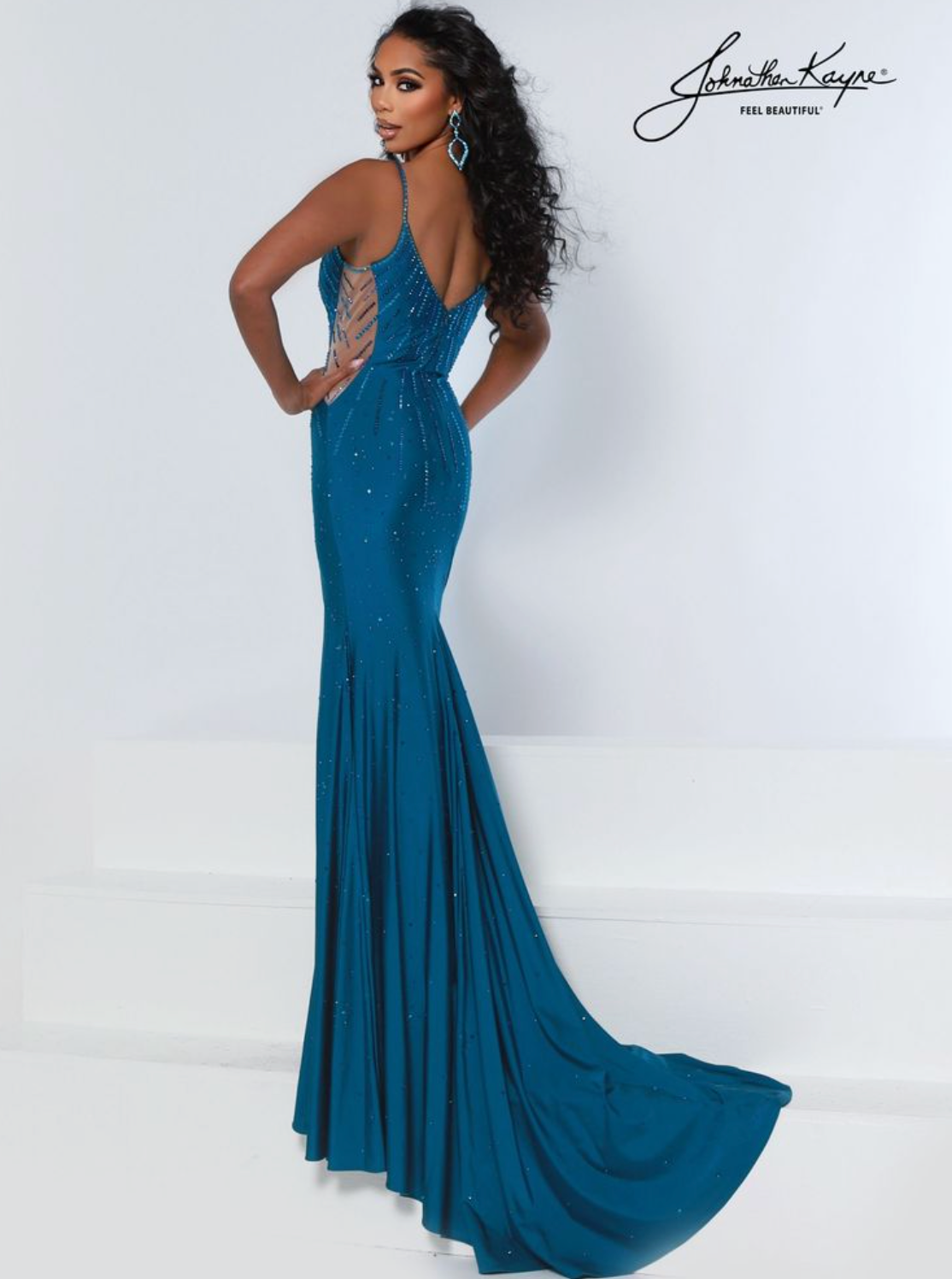 Make waves in this stretch lycra gown that shimmers with every move. The plunging neckline, illusion mesh sides, and high slit create a confident, prom ready look designed for those who love to shine.