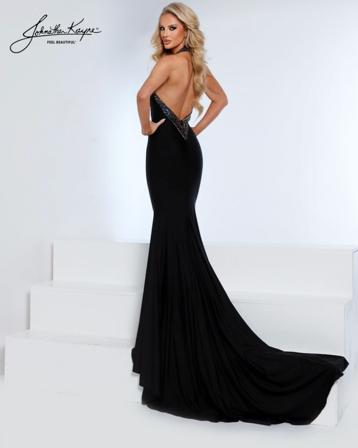 Turn up the edge in this halter gown with dazzling crystal accents. The sleek fit and open-back design creates an effortlessly glamourous look. Finished with a leg slit and sweeping train, this gown is ideal for prom, galas, or high-glam events.